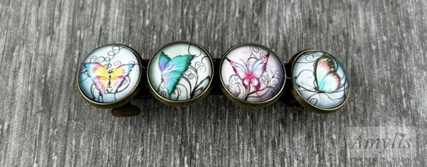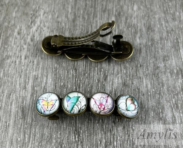 Ein Hauch von Magie im Haar: Die handgefertigte Haarspange „Butterfly Dreams“ verzaubert mit zarten Schmetterlingsmotiven in sanften Pastellfarben. Eingefasst in eine antik-bronzefarbene Metallfassung und veredelt mit schimmernden Glascabochons, vereint dieses Accessoire natürliche Leichtigkeit und märchenhafte Eleganz. Ideal, um deinem Look einen verspielten, romantischen Akzent zu verleihen – ob im Alltag oder zu besonderen Anlässen.