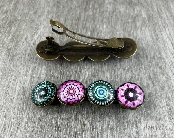 Die Kombination aus Türkis, Violett, Rosé, Grün und tiefem Schwarz erschafft ein harmonisches Spiel zwischen Ruhe und Energie. Das Licht bricht sich im Glas in zarten Reflexen, sodass die Spange je nach Bewegung anders erscheint: mal intensiv strahlend, mal sanft und verträumt. Der warm antik-bronzefarbene Rahmen ergänzt die farbenprächtigen Cabochons mit einer klassischen, leicht märchenhaften Note.