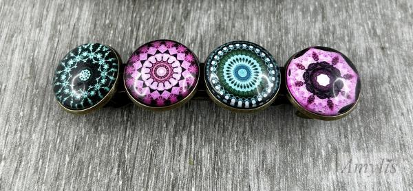 Die Haarspange „Kaleido Dreams“ trägt die Magie farbenreicher Traumwelten in sich. Vier kunstvoll gestaltete Glascabochons entfalten ein faszinierendes Kaleidoskop aus filigranen Mustern, leuchtenden Akzenten und sanft schimmernden Farbverläufen. Jeder einzelne wirkt wie ein kleines Universum aus Licht und Geometrie – geheimnisvoll, lebendig und poetisch zugleich.