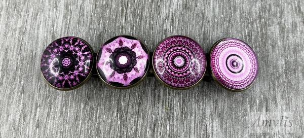 Die Haarspange „Magenta Mandala“ vereint vier kunstvolle Mandala-Motive, die in kraftvollen Pink- und Violetttönen erstrahlen. Jedes Cabochon wirkt wie ein eigenes kleines Universum – symmetrisch, hypnotisch und voller zarter Details, die sich in feinsten Linien und Formen entfalten. Die Designs erinnern an blühende Zauberblumen, tanzende Muster und leuchtende Sternenkreise, die sich endlos ineinander verweben.