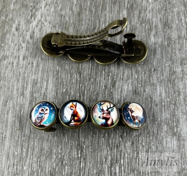 Tauche ein in die Magie des Waldes: Die handgefertigte Haarspange „Waldzauber“ aus der Mystic Creatures-Kollektion erzählt kleine Geschichten aus einer anderen Welt. Vier liebevoll gestaltete Motive – Eule, Fuchs, Hirsch und Reh – symbolisieren Weisheit, Mut, Stärke und Sanftmut. Eingefasst in eine antik-bronzene Fassung entsteht ein Accessoire, das wie ein Stück aus einem Märchen wirkt.