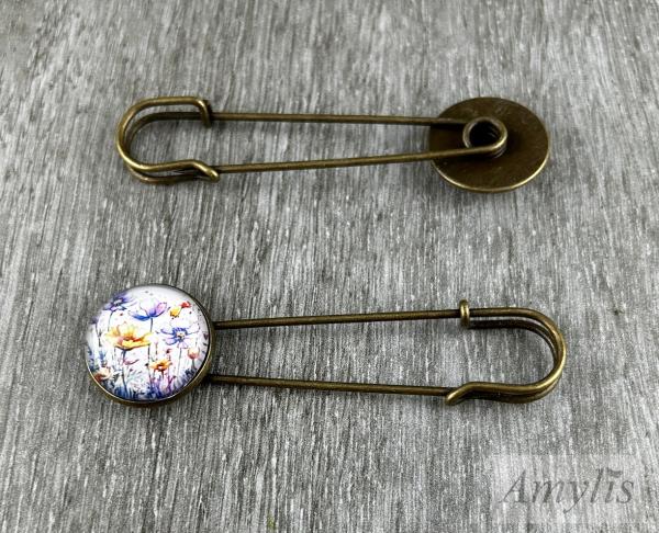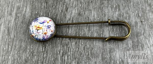 Zart, romantisch und voller sommerlicher Leichtigkeit: Die handgefertigte Tuchnadel „Wildflower Garden“ zeigt ein liebevoll gestaltetes Blumenmotiv, das an eine blühende Wiese im warmen Abendlicht erinnert. Feine Aquarellfarben in Gelb, Rosa, Lila und Blau verschmelzen zu einem sanften, poetischen Gesamtbild – wie ein kleines Stück Natur, eingefangen unter einer klaren Glaskuppel.
